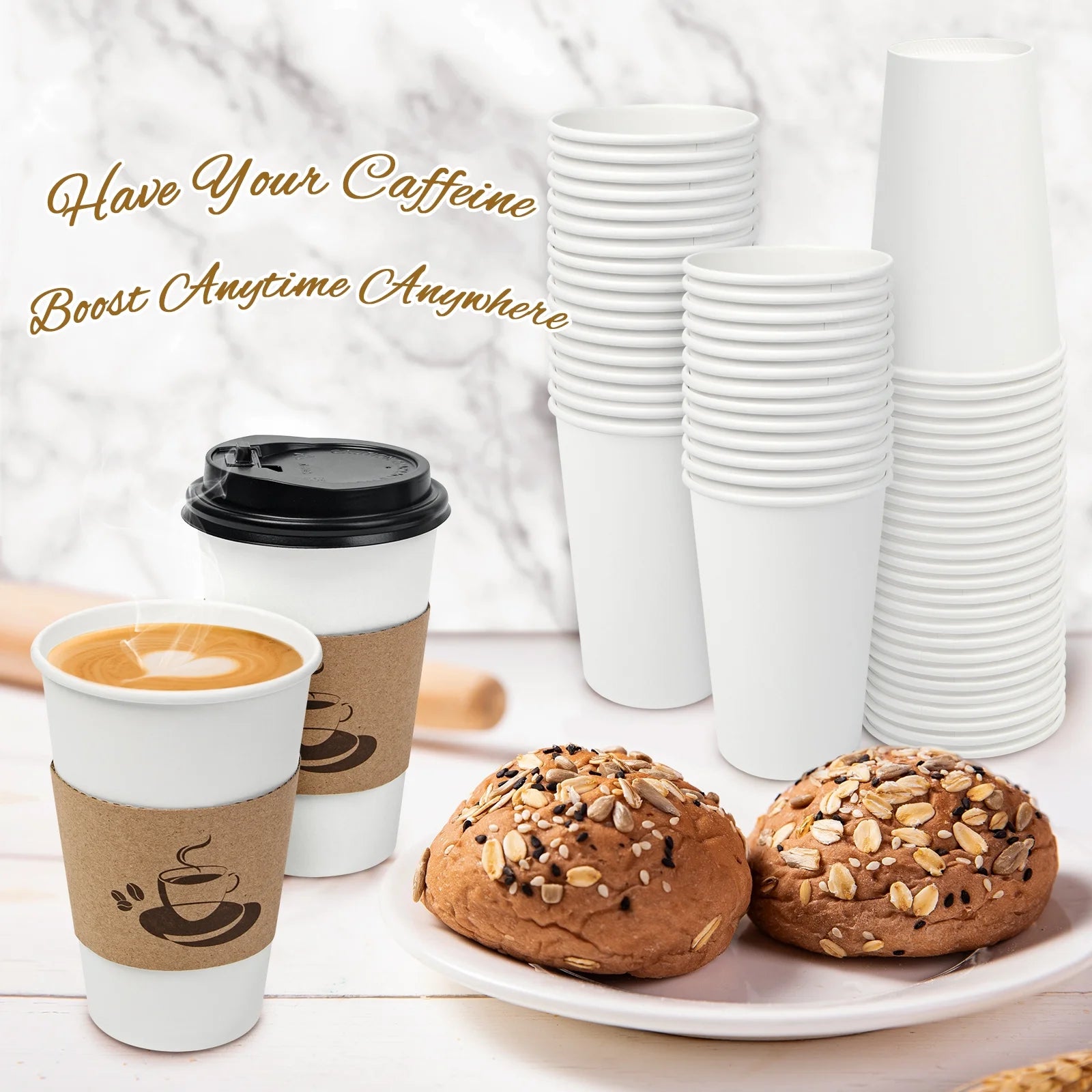 • Treamon 50 pack 16 oz paper cup with lid disposable cup hot cup Complete Package: The 50 paper cups in a whole set include 50 pack coffee cup disposable 16 oz, 50 black cup lids and 50 kraft paper covers. This paper coffee cup combination allows you to make your own coffee at home.