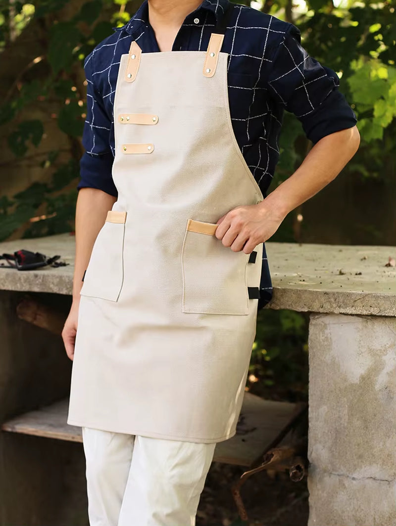 CROSS BACK APRON:The apron is equipped with adjustable belts, which are cross back apron , which can better distribute the pressure and prevent neck pain. The strap joint made of the first layer of cowhide shows high quality,Won't break.