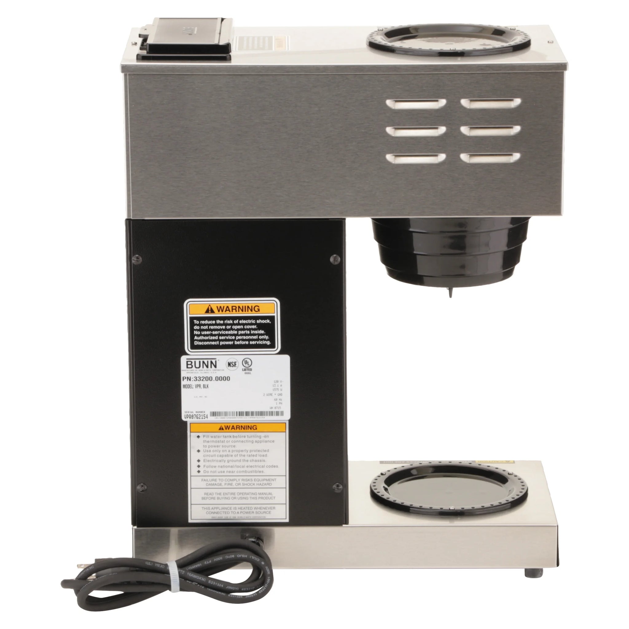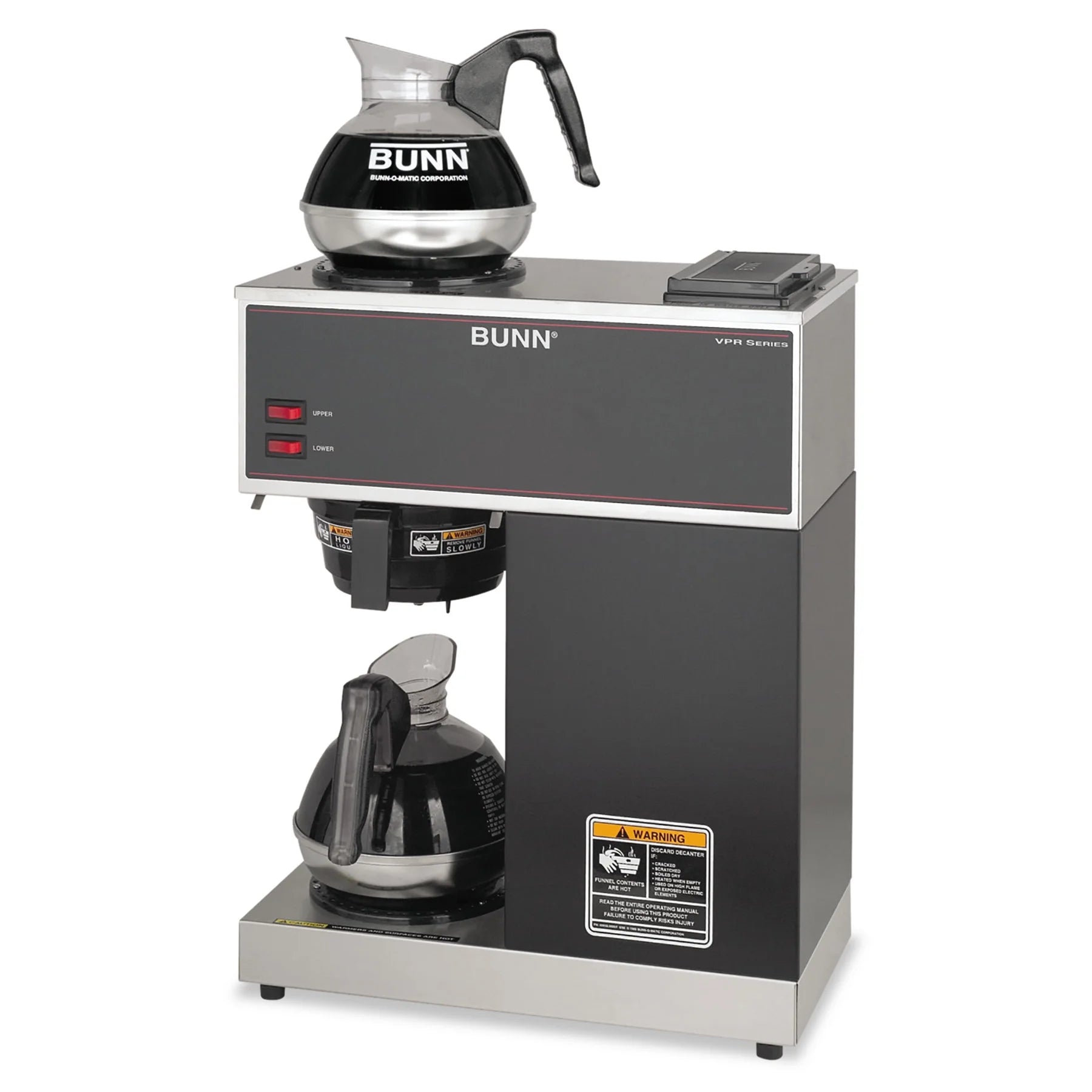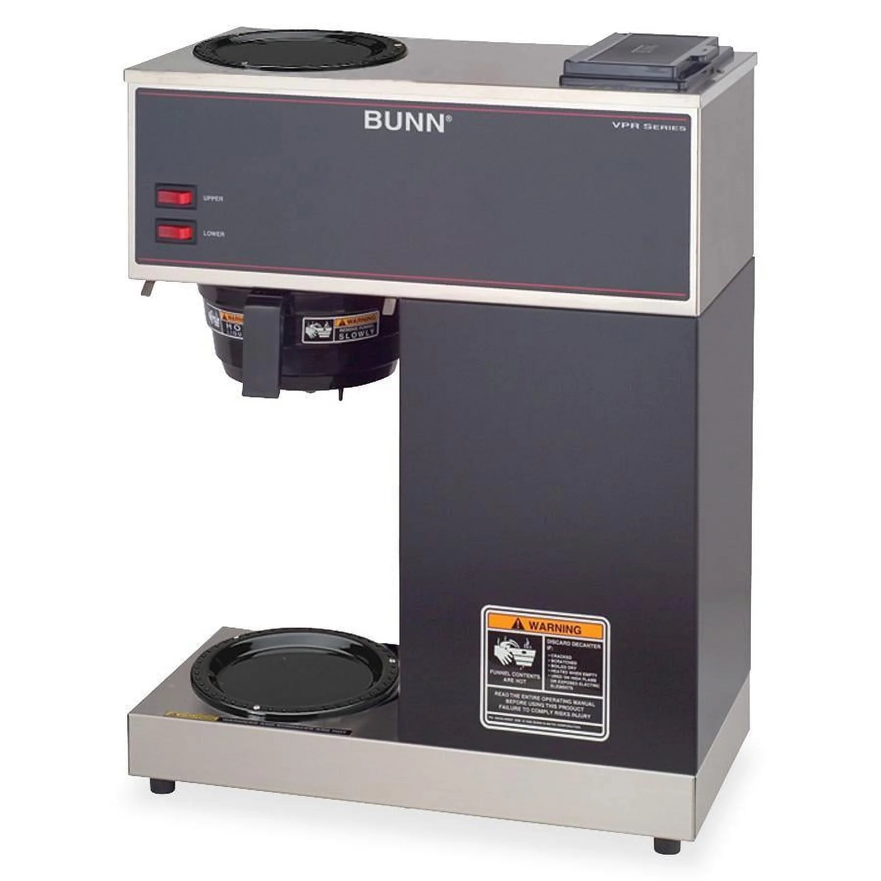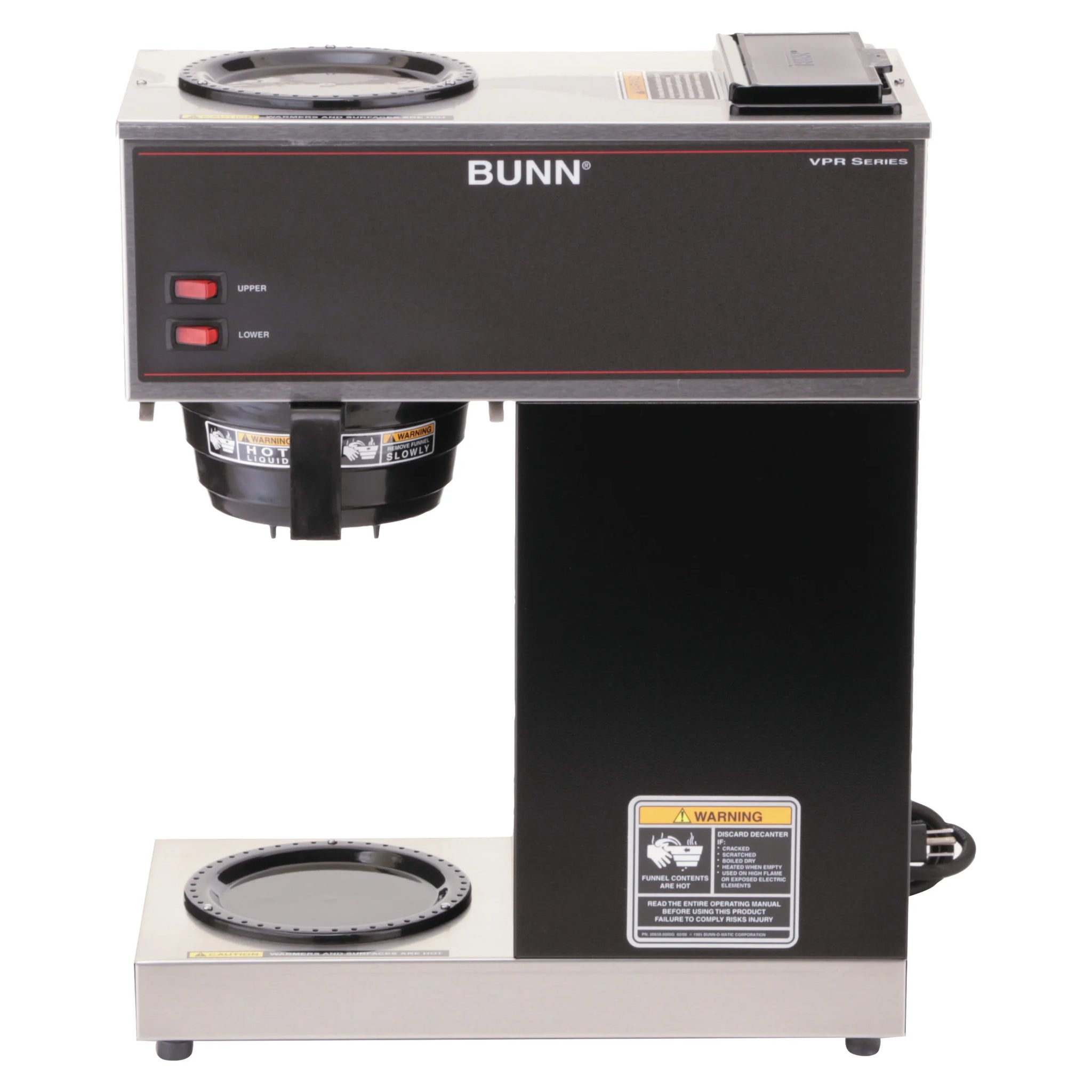 The BUNN 33200.0000 VPR 12-Cup Pourover Commercial Coffee Brewer with Upper and Lower Warmers in Black is an integral part of any office coffee service program. Totally portable, the brewer can be used anywhere there's a plug! Just pour cold water in the top and coffee brews immediately, up to 3.8 gallons per hour directly into standard 12-cup (64-ounce) decanters. It’s black finish allows for quick and easy clean up and the SplashGard funnel protects the user from burns. Decanters not included.