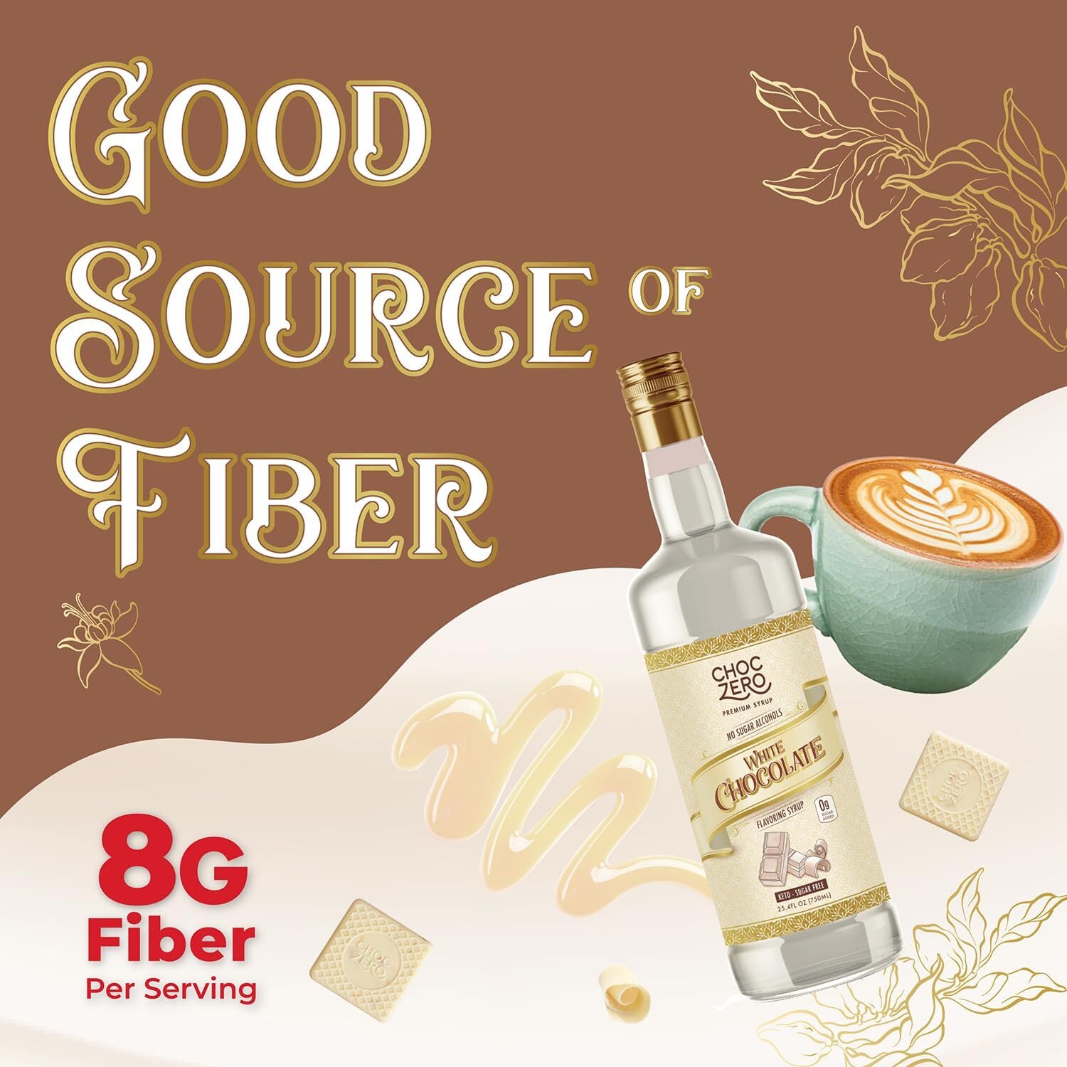 • Our white chocolate syrup has no added sugar, but we do add a secret ingredient: prebiotic fiber! The first functional fiber syrup for coffees, ChocZero's coffee syrup lets you add fiber to promote gut health and feel full with every sip