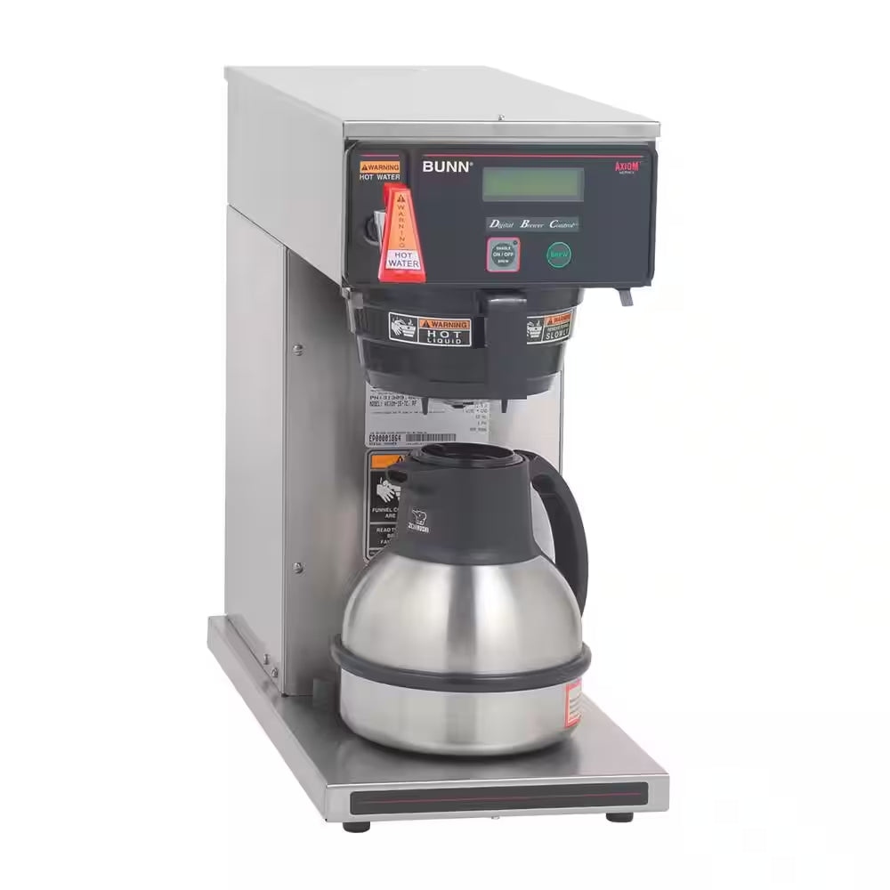 BUNN 38700.0011 AXIOM-DV-TC thermal digital automatic coffee brewer with LCD and 1-warmer includes dual voltage functionality and a large 200 oz. tank that provides back-to-back brewing capacity. BrewWIZARD technology simplifies brewer programming with an LCD display. Just set the brew level, cold brew lock-out and tank temperature from the front of the machine and the brewer does the rest. Coffee extraction is controlled with pre-infusion, pulse brew and digital temperature control and includes a hot water faucet and SplashGard funnel detects hot liquids away from the hand. Ideal brewing solution for offices, restaurants, healthcare and hospitality. Thermal carafes sold separately.